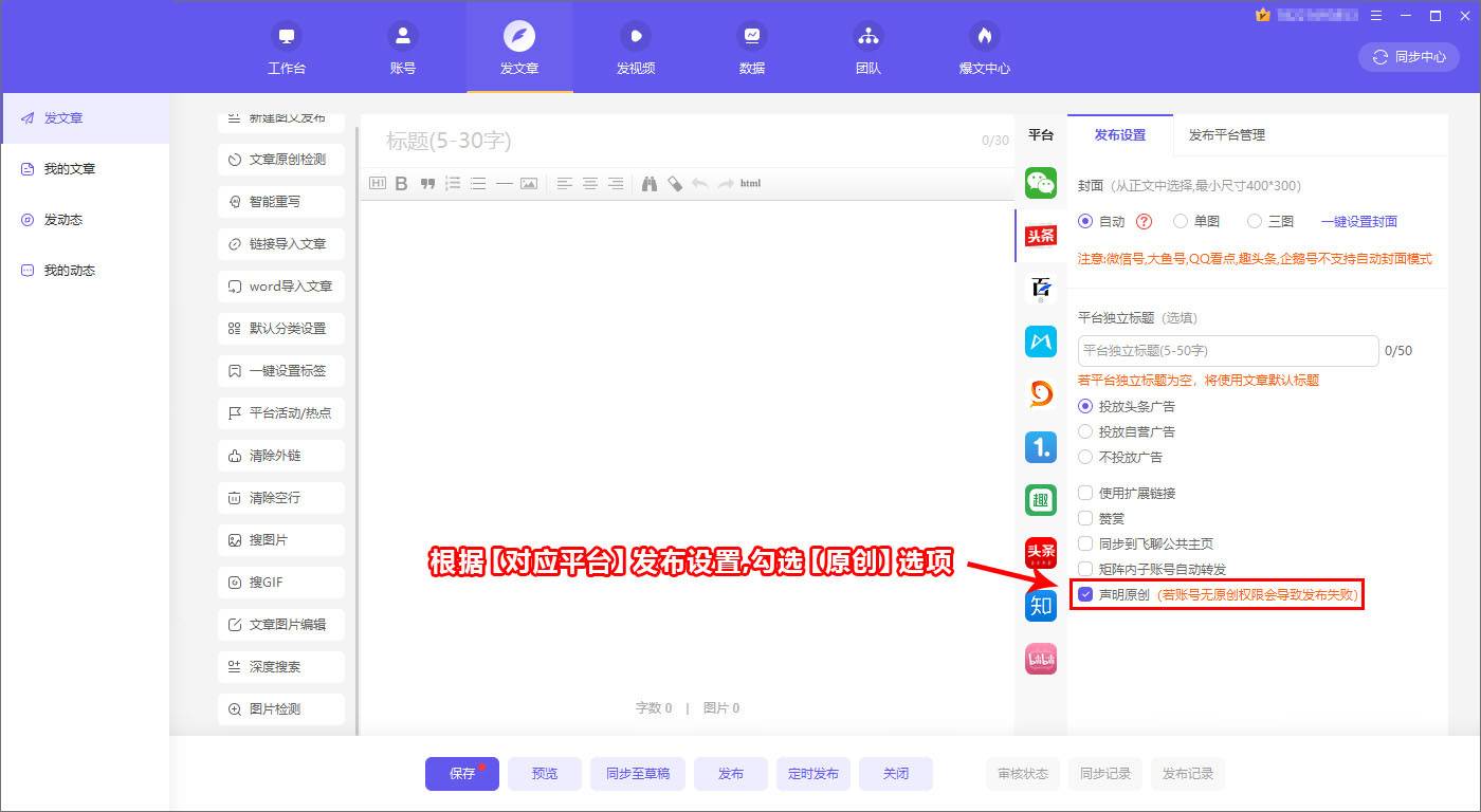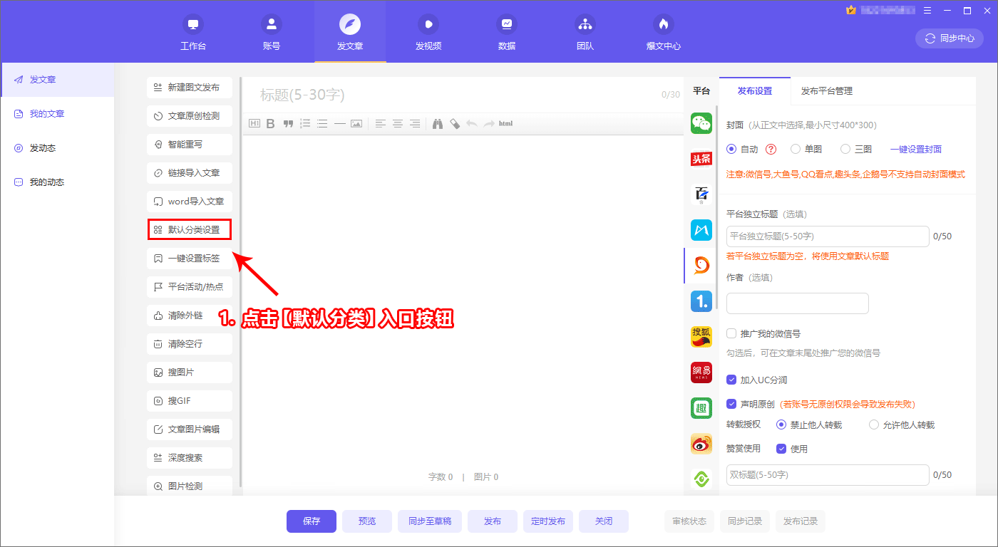 鐐瑰嚮涓誨鑸愬彂鏂囩珷銆戠紪杈戝ソ闇瑕佸彂甯冪殑鍐呭銆傜偣鍑誨彸渚у鉤鍙版爮錛岄拡瀵規枃绔犮愭墍闇鍙戝竷騫沖彴鐨勮繘琛岀嫭绔嬭緗戣緗椂娉ㄦ剰鏂囧瓧鎻愮ず錛屾湁浜涘鉤鍙版煇浜涢」涓哄繀濉」錛屽繀濉」蹇呴』閫夋嫨鍚﹀垯浼氬鑷村彂甯冧笉鎴愬姛銆?