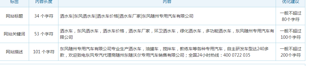 網站的TDK是應該網站的重中之重,網站的TDK能決定網站長期發展排名情況,剛接到站的時候,網站TDK設置非常不合理,標題只有“東風隨州專用汽車有限公司”,關鍵詞和描述都只是“灑水車”,這是非常不合理的,在跟客戶進行溝通后,我們對網站的TDK進行了重新編輯填充。