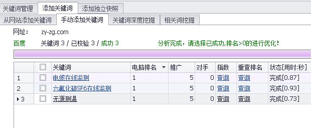 現在目標關鍵詞:無源測溫,六氟化硫SF6在線監測,電纜在線監測 排名在百度首頁(因地區差異,排名有所差動);相信根據小編的優化方案進行優化,必定在不久的將來剩余的目標關鍵詞《無線測溫》也會逐漸出現在百度排名首頁。